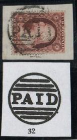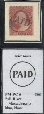 Sc. 26 FINE appearing example w/ Fall River, MA "PAID" cancel in Circle (Skinner-Eno PM-PC-6) rarity-3 Our price=$25.00