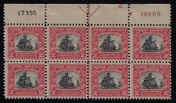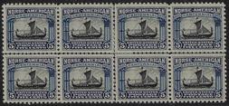 Sc. 621 VF appearing center line block of 8 (TOP hinged & BOTTOM never hinged) Our Price=$105.00 |